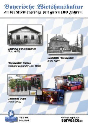 Le "duo" existe depuis 2000. Depuis environ 50 ans, la bière est servie et célébrée dans les locaux et la tradition est respectée. L'offre de boissons du "duo" a dépassé sa taille spatiale. Nous offrons à nos clients sept bières du tonneau (Pilsner Urquell, Tegernseer Hell, Frankenheim-Alt, Früh-Kölsch, Augustiner Hell, Bières Baumburger (Chiemgau), Murphy Murphy, de la bouteille Kilkenny, Unertl Weissbier, Beck's) et alors un robinet serait gratuit pour une bière spéciale. La sélection de spiritueux, vins et boissons non alcoolisées peut également être vue. Des plats délicieux tels que: des huîtres, des sandwichs sprats / saumon avec des œufs perdus, un pain de viande, du Mett au Röggelchen, des pâtes, une tarte, des pizzas, de la Weisswurst à la Currywurst sont également au menu. L'emplacement est idéal pour les petits partis avec la société fermée de 20 à environ 40 personnes.